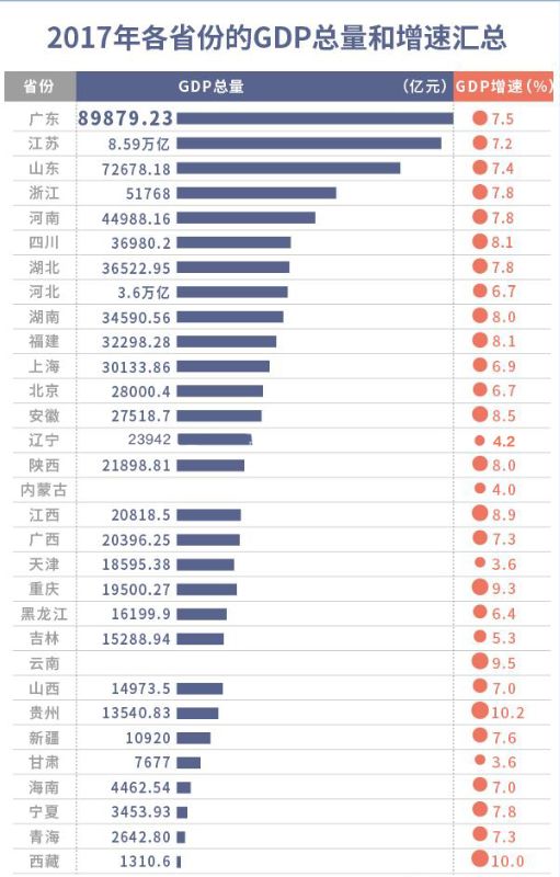 GDP增速领跑全国的是中西部省份。2017年,贵州、西藏的GDP增速继续保持两位数增长,也是去年仅有的两个保持两位数增长的省份,分别达到10.2%、10%。紧随其后的是云南和重庆,GDP增速分别为9.5%和9.3%。