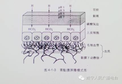 厚约0.5mm的粘液层和HCO3-为第一道防线,它将胃粘膜与胃腔内的胃酸、胃蛋白酶隔离开来,防止胃酸直接腐蚀胃粘膜和胃蛋白酶引起的自身消化。HCO3-可与渗透入粘液层的氢离子(H+)中和,防止H+直接与上皮细胞接触造成损伤;