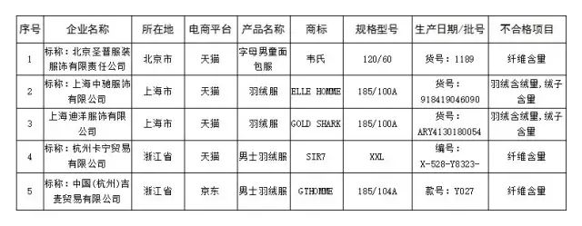 4、羽绒服不合格产品名单