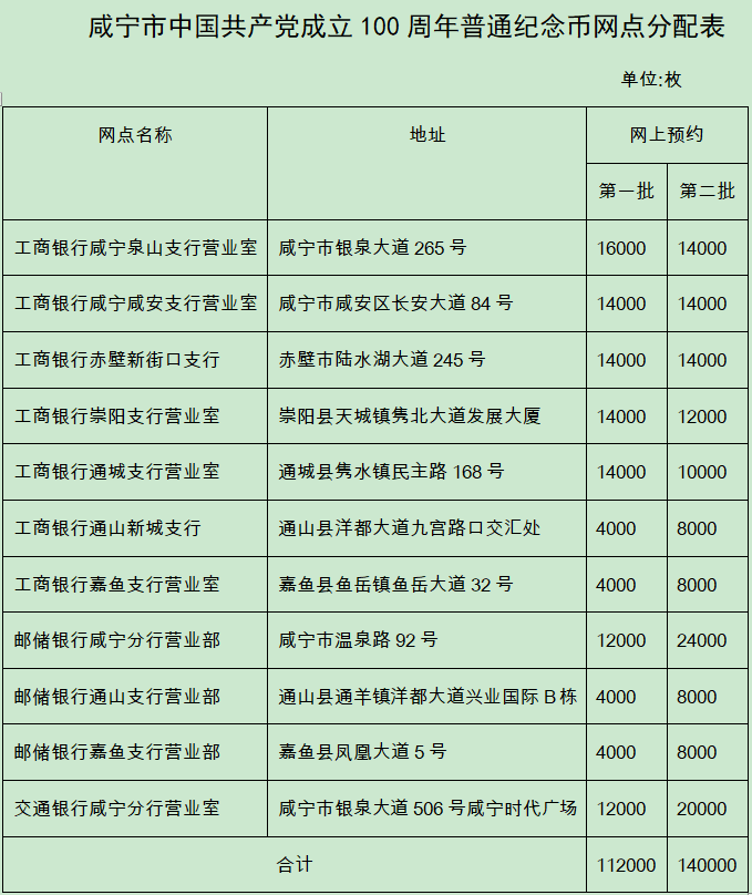 附件:咸宁市中国共产党成立100周年普通纪念币网点分配表