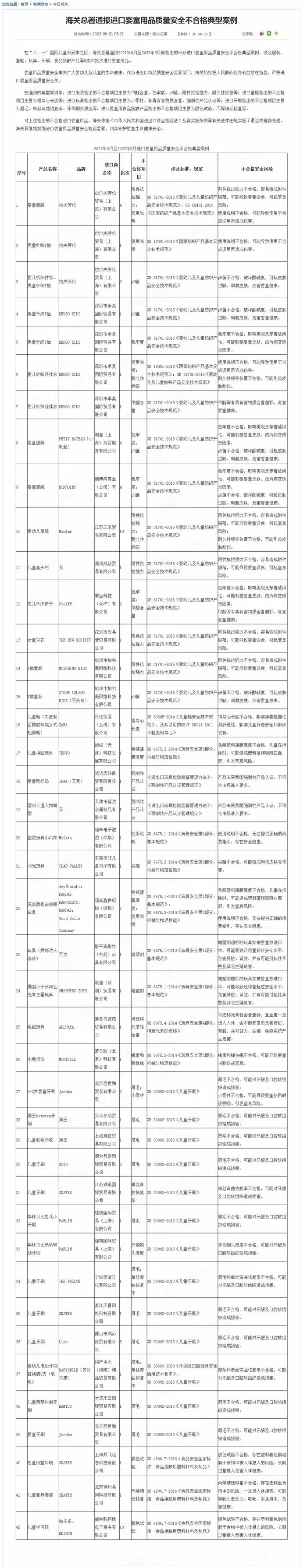 海关总署网站6月1日通报2021年6月至2022年5月间检出的部分进口婴童用品质量安全不合格典型案例,涉及服装、童鞋、玩具、牙刷、食品接触产品等5类82批次进口婴童用品。包括拉夫劳伦、ZARA、Jordan、KENZO KIDS、MOSCHINO KIDS等品牌。