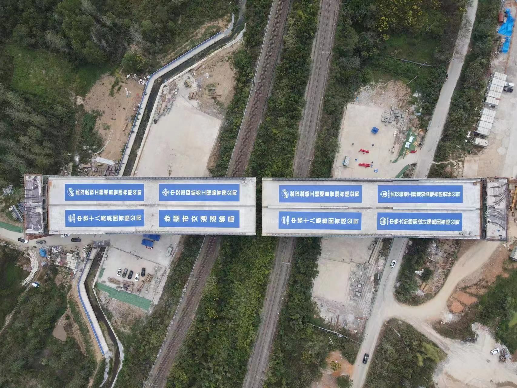 跨线桥位于赤壁市中伙铺镇,每座转体桥长220米,桥面宽26.7米,重达1.6万吨。此次桥梁转体时间短、转体重量大、安全风险高,同时,桥梁跨越京广铁路双线,对转体技术和精度的要求严格。负责此次桥梁转体施工的中铁十八局建设人员克服种种困难,抢抓铁路运行“天窗”时段,对转体过程进行实时跟踪,确保万吨重的桥梁平稳转体,同时最大程度减少对铁路线的干扰。