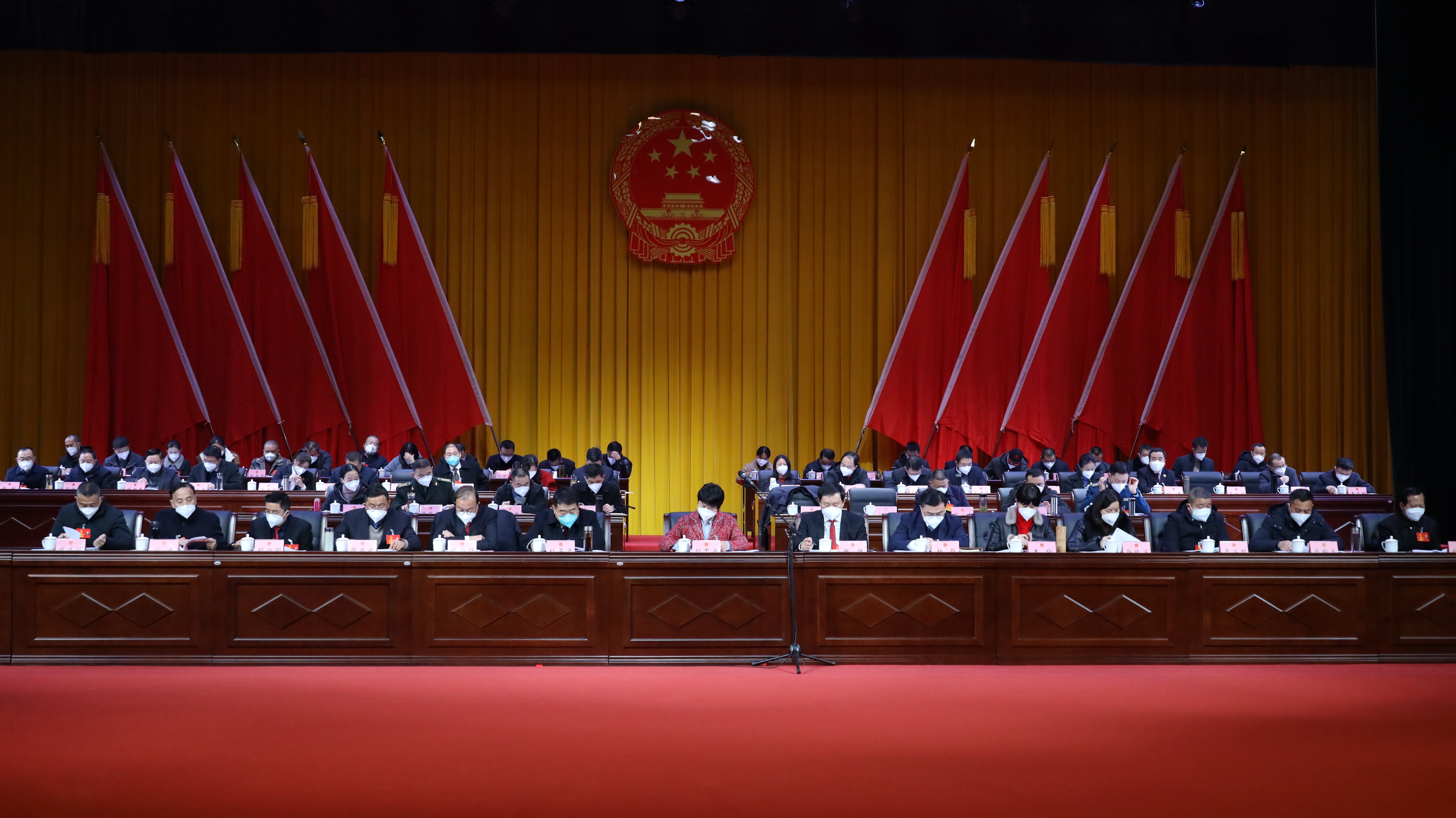 刘中英、张胜、刘季平、杨昌、傅新祥、王玲、周益斌、郭晓富、胡旭明、李三明、金关、吴鹤奎、陈志明、胡建平在主席台前排就座。杨修伟、汤会礼等县委常委、县政府、县政协领导、法检两长等在主席台就座。