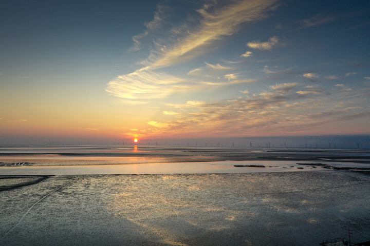 盐城东台条子泥湿地日出景象(2022年11月9日摄,无人机照片)。新华社记者 杨磊 摄