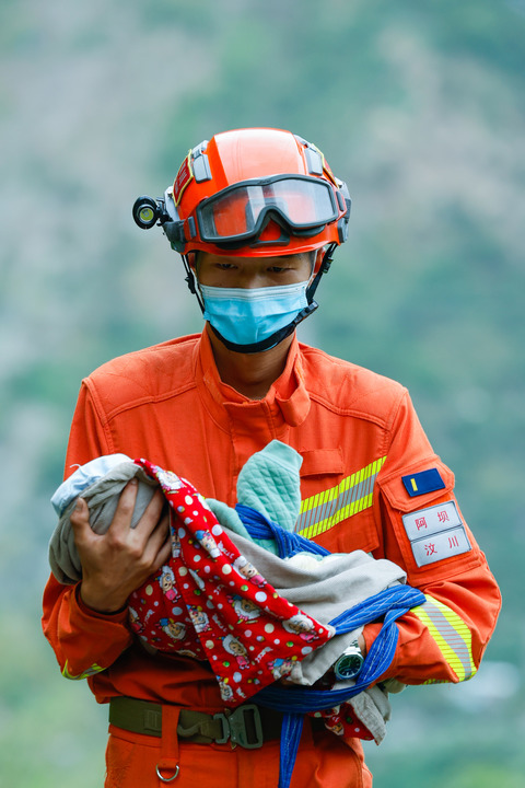 2022年9月6日,在四川泸定地震救援中,阿坝森林消防支队汶川大队队员张自立怀抱一名从泸定县得妥镇湾东村疏散出来的2个月大的婴儿,前往安全地区。他被网友称为“汶川哥哥”。新华社记者 沈伯韩 摄