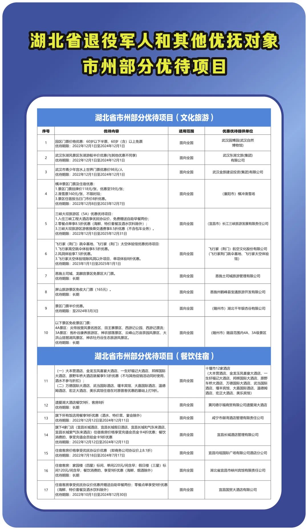 免票!打折!湖北这一群体福利来了 2023-01-11 08:50 0 近日,2022年度“荆楚楷模·最美退役军人”颁授、湖北省第三届退役军人专场招聘会暨“荆楚老兵人才网”启动、全省退役军人和其他优抚对象优待项目签约发布仪式在汉举行。在发布仪式现场,湖北省退役军人事务厅发布了全省退役军人和其他优抚对象首批省级优待项目以及市州部分优待项目,涵盖文化旅游、餐饮住宿、商超消费、医疗健康等领域。 来源:湖北发布、湖北省退役军人事务厅 (编辑 杨紫妮)