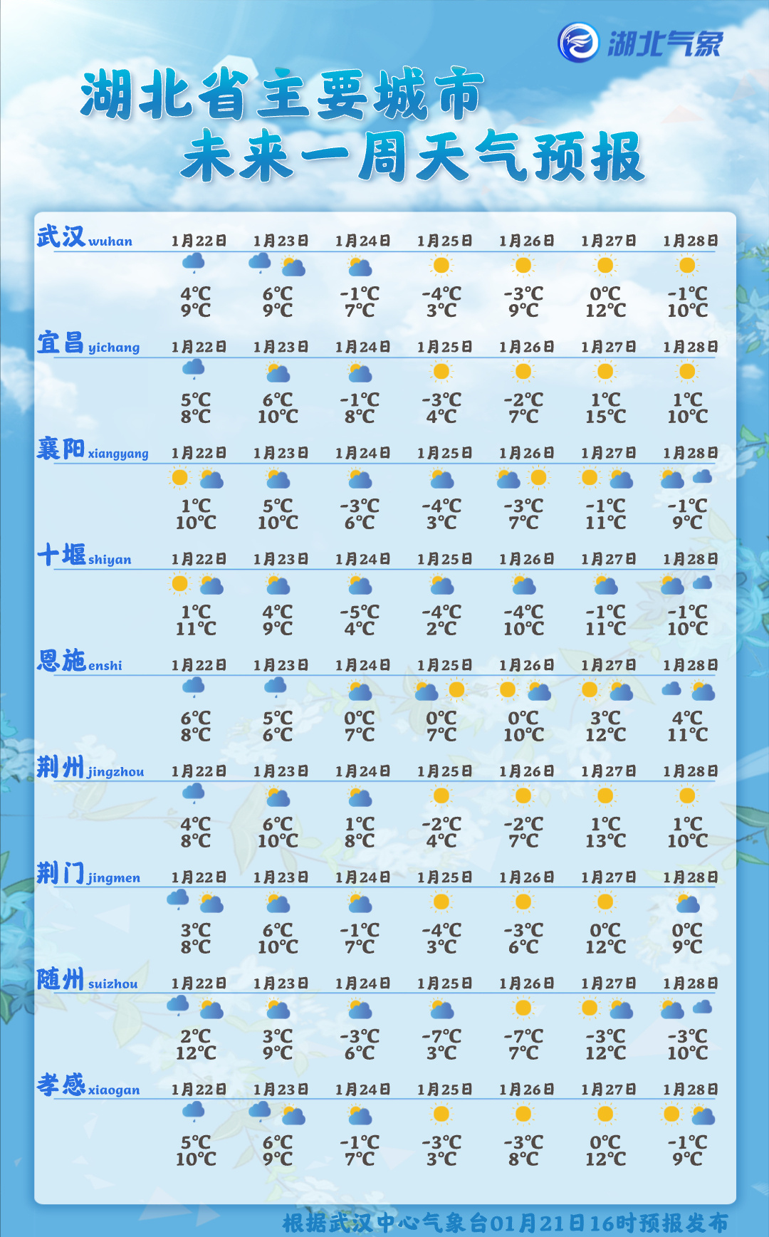 鄂西北、江汉平原北部阴天到多云;其他地区阴天有小雨,其中西部高山地区有雨夹雪或小雪。