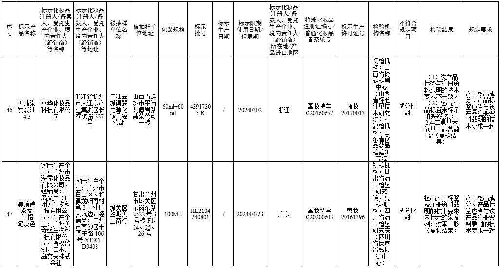 记者注意到,此次通报的70批次不符合规定化妆品多为染发膏、洗发液、牙膏等,抽检发现的主要问题是成分比对、菌落总数等不符合规定项目,部分批次检出含量超过规定限值的苯基甲基吡唑啉酮。