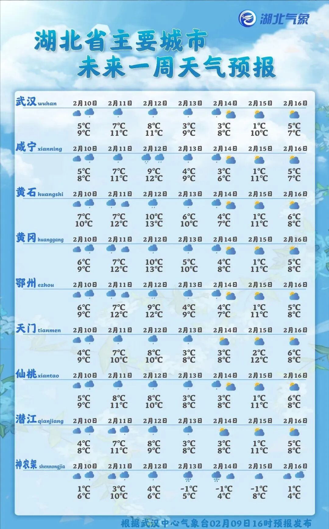 雨҈ 雨҈ 雨҈+降温!湖北省又将迎来新一轮降水 2023-02-10 08:51 0 雨雨雨雨雨 阴雨还将延续 阳光何时回归? 昨晚 湖北省大部地区降水短暂间歇 今天和周末 受高空多波动影响 湖北省又将迎来新一轮降水 下着下着雨 到了周日 冷空气又要来了 未来三天 湖北省仍以阴雨天气为主 提醒公众外出随身携带雨具 路面湿滑 注意交通安全 同时 气温仍旧比较低迷、湿冷 外出及时添衣保暖 湖北省主要城市未来一周天气预报 来源:长江云、湖北气象 (编辑 余惠)