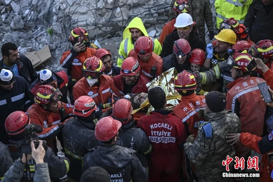 图为当地时间2月10日,土耳其安塔基亚,中国救援队与土耳其当地救援力量通力合作,在地震发生108小时后成功营救出幸存者。