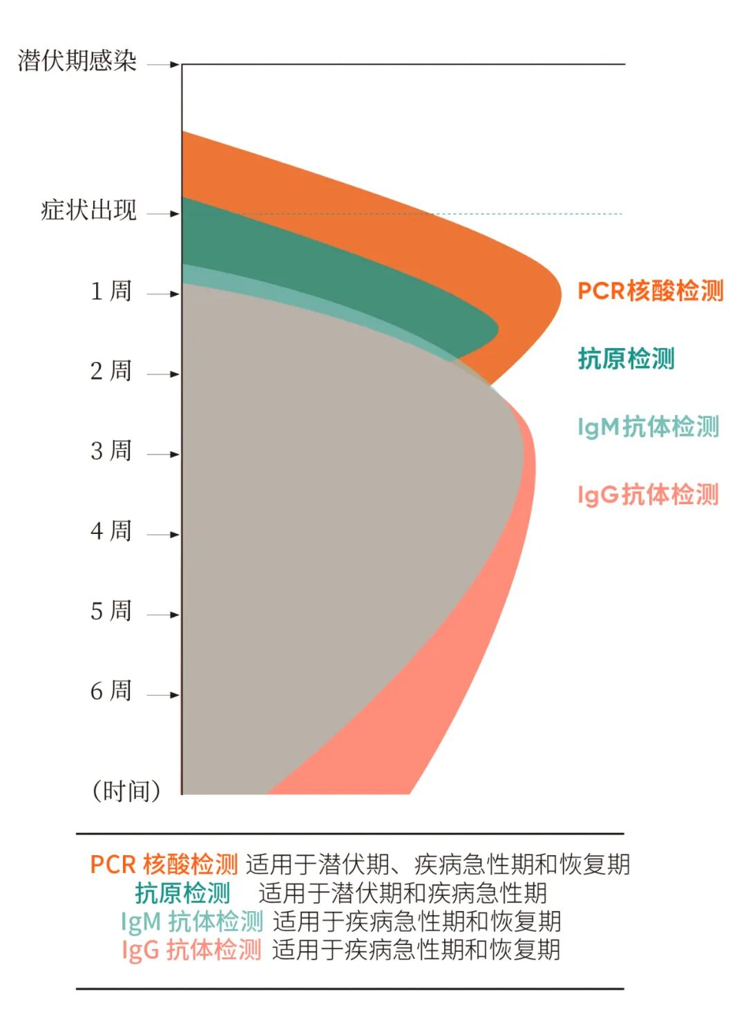 新型冠状病毒检测项目在不同感染病程中的应用示意图