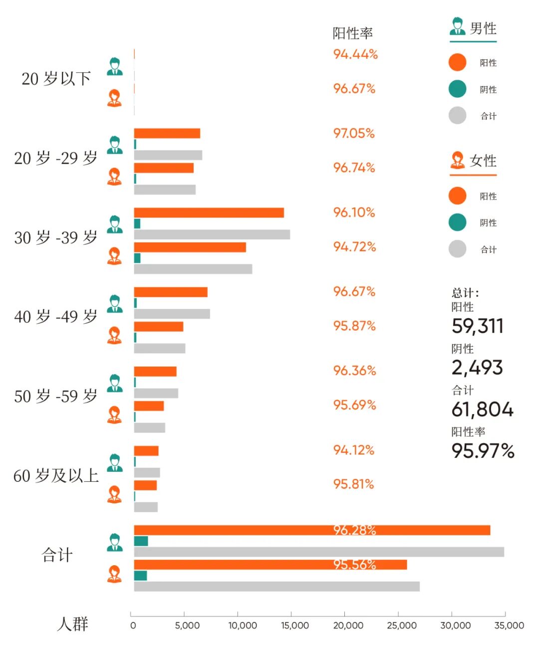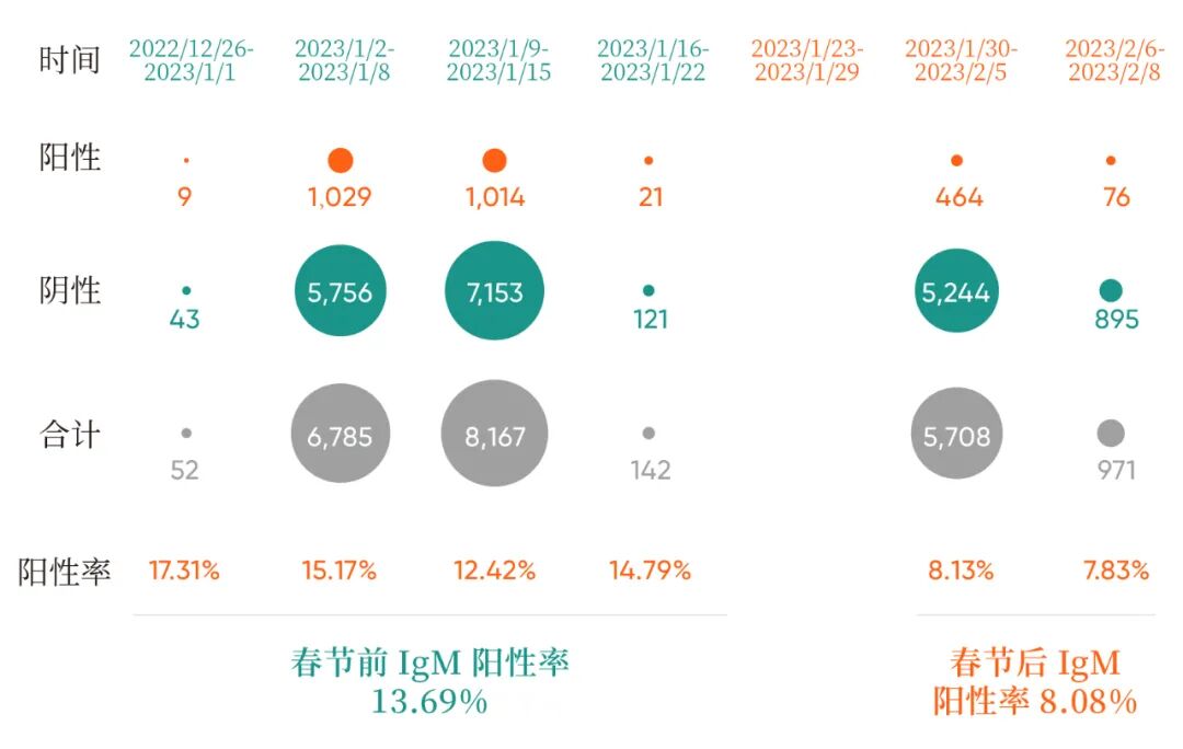 根据爱康发布的统计数据显示,自2022年12月26日至2023年2月8日,参与新型冠状病毒抗体IgG检测的人群中约96%的用户检出新型冠状病毒抗体IgG阳性,在男性和女性中差异不大,在不同年龄组别中也无明显差异。此外,自2022年12月26日以来,新型冠状病毒抗体IgM的总体阳性率为11.97%,随时间推移,IgM阳性率出现一定下降趋势。①