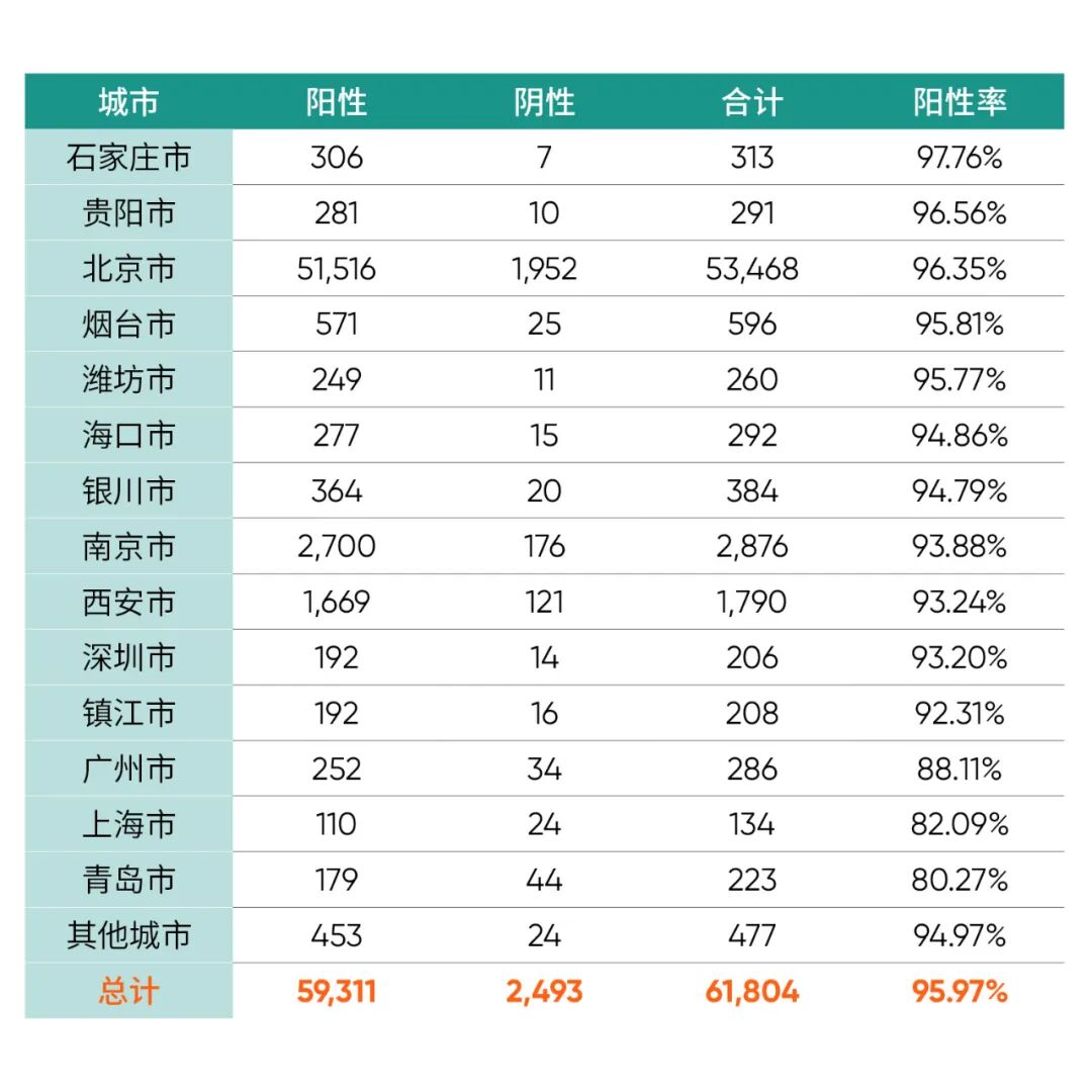 新型冠状病毒抗体 IgG 阳性率较高的城市中,有石家庄市(97.76%)、贵阳市(96.56%)、北京市(96.35%)、烟台市(95.81%)、潍坊市(95.77%)等。