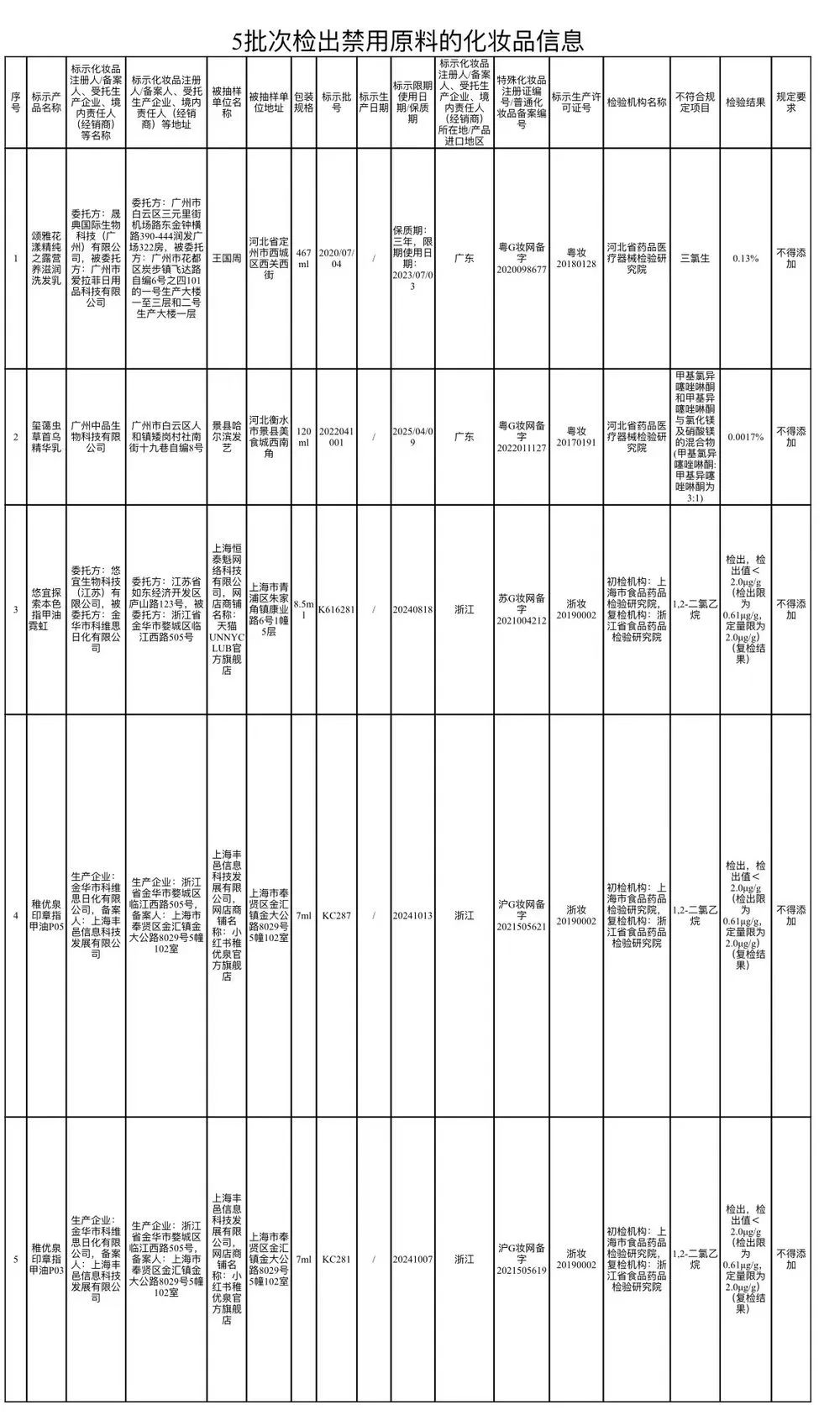 在2022年国家化妆品监督抽检工作中,经河北省药品医疗器械检验研究院等单位检验,产品标签标示为委托方晟典国际生物科技(广州)有限公司、被委托方广州市爱拉菲日用品科技有限公司生产的颂雅花漾精纯之露营养滋润洗发乳等5批次化妆品,检出《化妆品安全技术规范(2015年版)》中规定的禁用原料。
