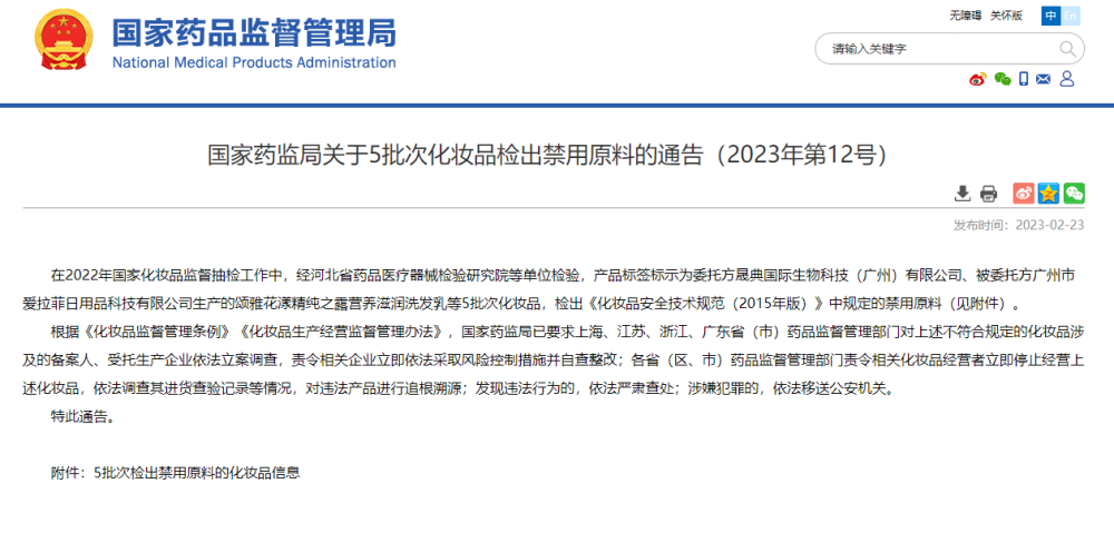 国家药监局关于5批次化妆品检出禁用原料的通告(2023年第12号)