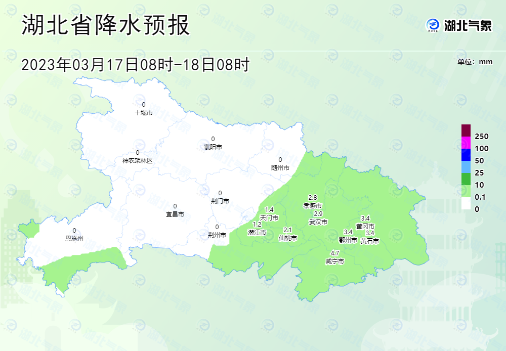 鄂西南南部、江汉平原南部、鄂东北、鄂东南阴天有中到大雨;其他地区小雨转多云。