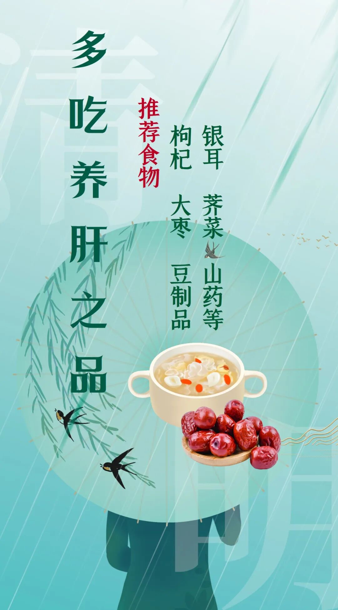 立春之后,人体肝气渐盛,在清明之际到达最旺,容易出现眼睛干涩、烦躁易怒等易上火的情况,甚至可能引发心脑血管疾病、呼吸系统疾病、消化系统疾病等。清明时节正是养肝的大好时机,可以多吃枸杞、大枣、豆制品、银耳、荠菜、山药等对肝脏有益的食物。