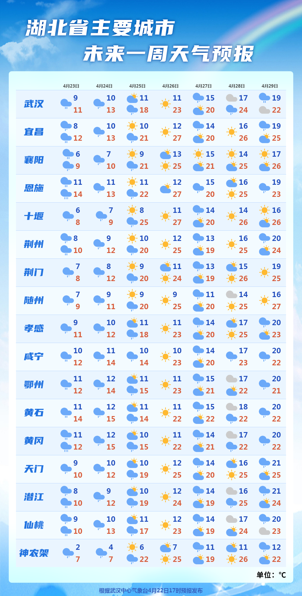 最低气温:鄂西北5~8℃;其他地区8~11℃