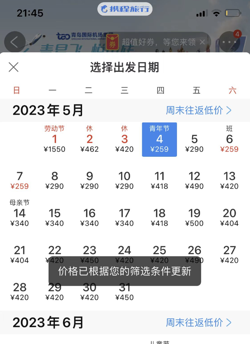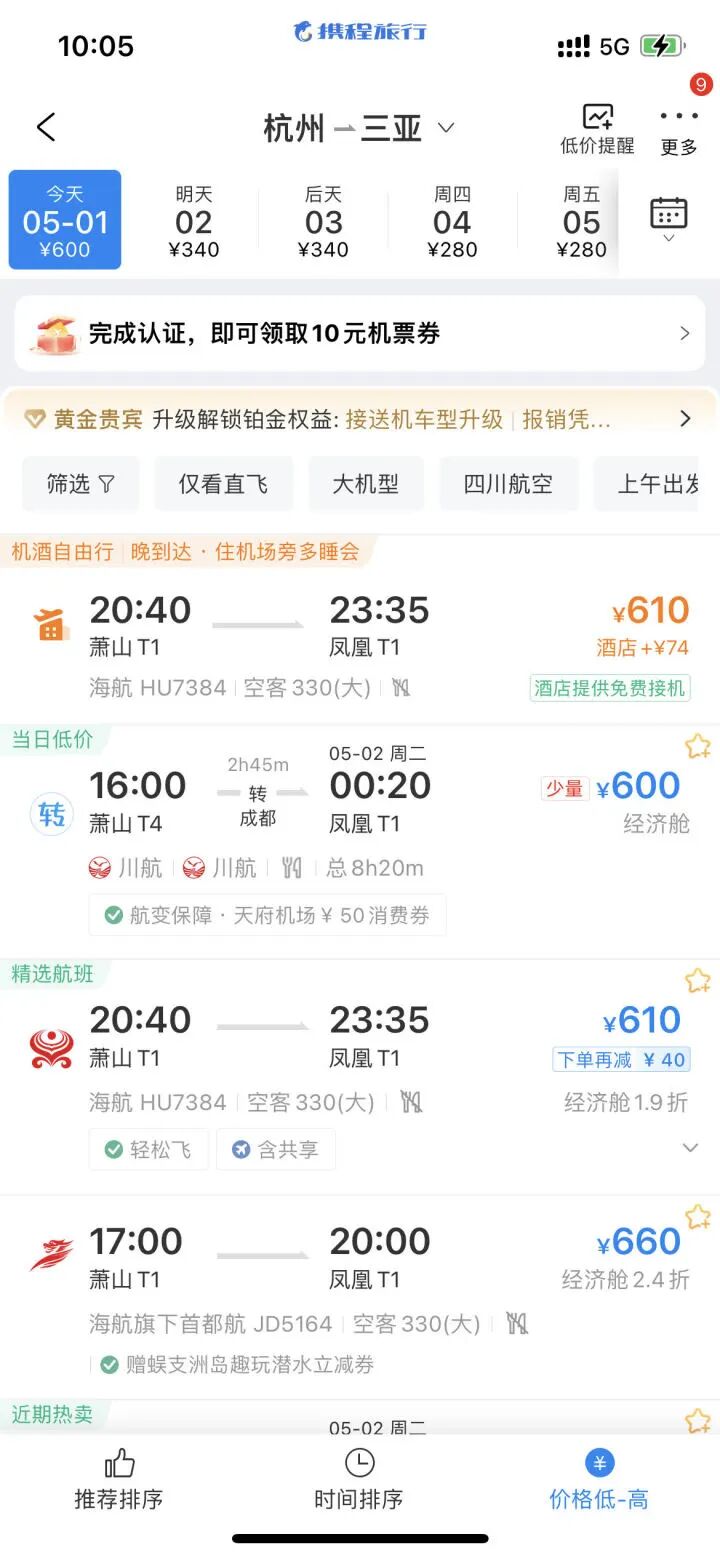 五一前,杭州飞三亚价格最低2800元,5月1日机票价格是600元,而到5月4日,杭州飞三亚居然只要280元。