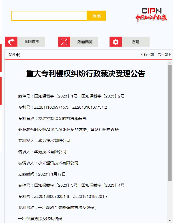 公告显示,2023年1月17日,国家知识产权局受理了请求人华为提出的被请求人小米侵犯其四项中国专利的案件,这四个专利分别为: