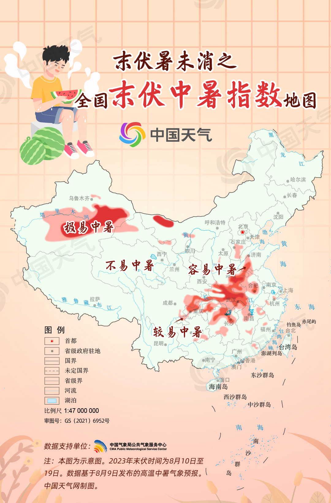 从中国天气网推出的全国末伏中暑指数地图中可以看出,今年末伏期间,新疆南疆盆地中部和吐鲁番盆地、内蒙古西部还将经历高温酷热天气,河南中南部、湖北中北部等地则可能出现高温加高湿的桑拿天,因此上述地区都属于极易中暑的区域;山东西南部、河南东南部、湖北中部和东部、四川盆地东部、湖南中北部等地的部分地方也会连续出现高温天气,闷热难耐,属于容易中暑的区域;新疆南疆盆地大部、河北南部、安徽西部、湖南北部、江西中北部、四川盆地到重庆中北部等地的一些地方高温天气也将不时地刷下存在感,属于较易中暑的区域。
