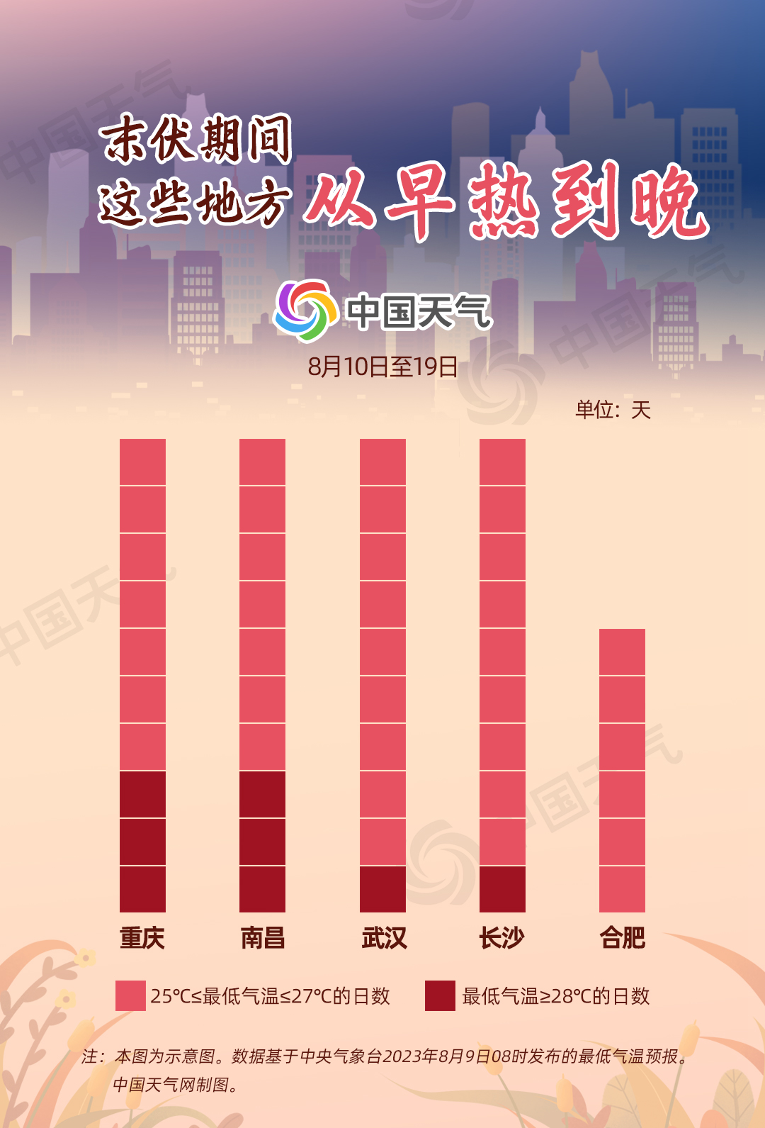从省会级城市的最低气温来看,末伏期间,重庆、南昌、武汉、长沙连续十天的最低气温都在25℃或以上,其中重庆、南昌还有三天会达到28℃,真正的从早热到晚。当地的小伙伴们如果不开空调,真是要热到睡不着了。