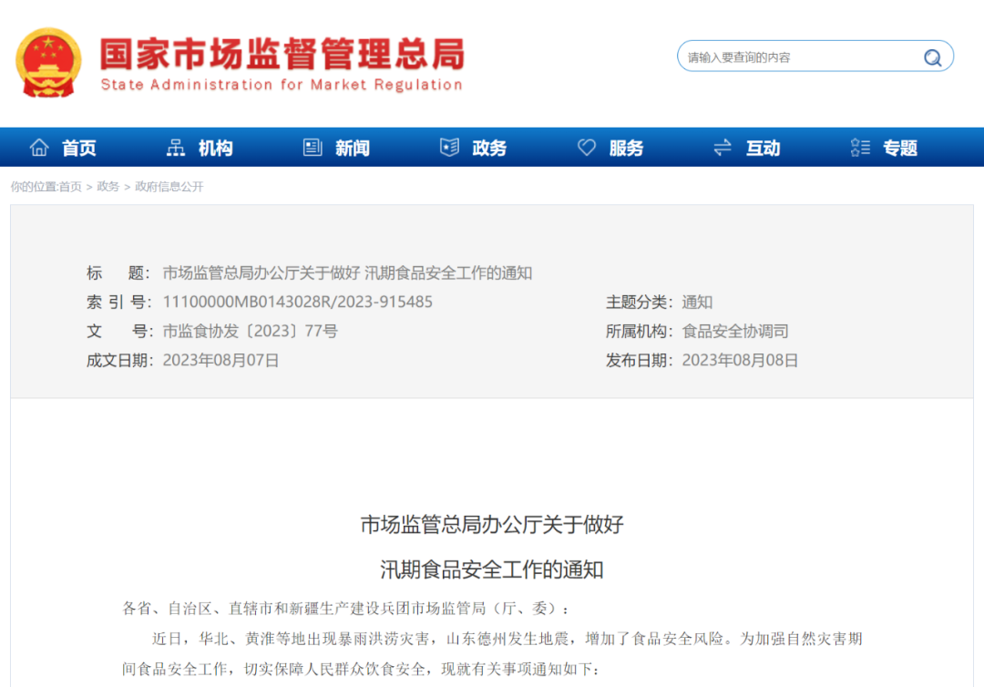 近日,华北、黄淮等地出现暴雨洪涝灾害,山东德州发生地震,增加了食品安全风险。为加强自然灾害期间食品安全工作,切实保障人民群众饮食安全,日前市场监管总局办公厅发布《关于做好汛期食品安全工作的通知》,全文如下:
