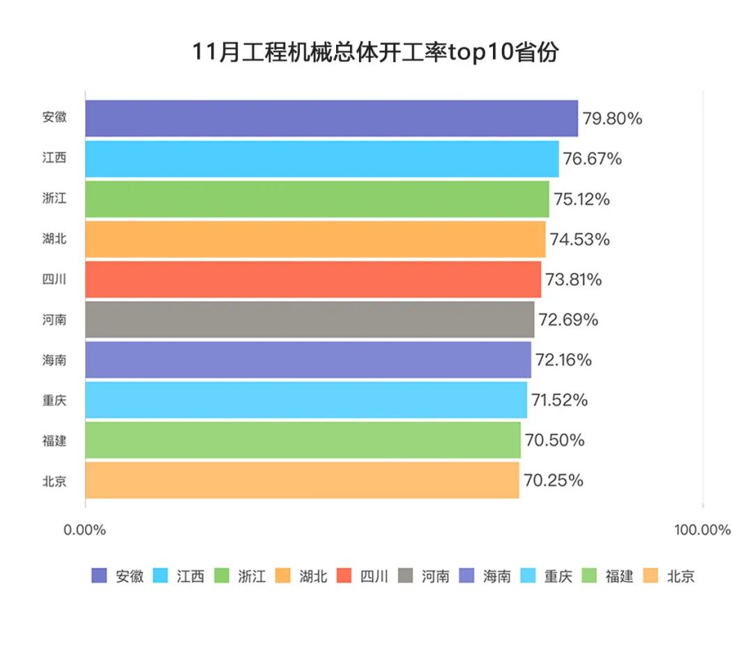 11月,安徽、河南、湖北各有7类设备平均作业量同比增长,江西有3类设备平均作业量同比增长,主要集中在汽车起重机、履带起重机、挖掘机。