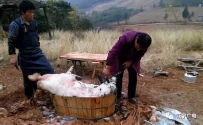 ▲ 杀猪师傅们在用开水烫猪