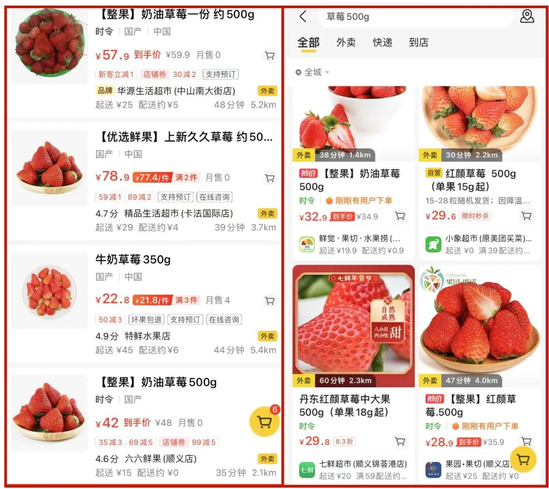 美团APP上,此前价格在40-80元左右/斤的草莓(左),售价也跌至30元左右/斤(右)。图片来呀:北青社区报