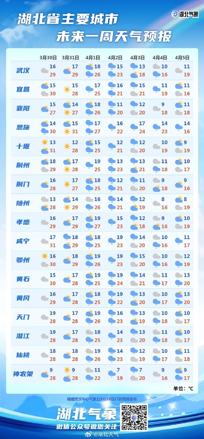 另据湖北最新天气预报,4月1日起,全省阴天转小到中雨,其中鄂东南、江汉平原、鄂西南东部、鄂西北局地大雨或暴雨。省内部分地区伴有强对流天气。