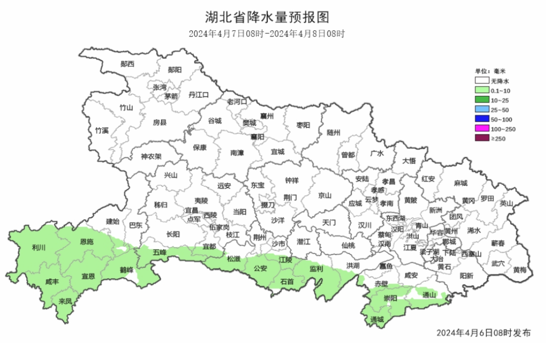 7日08时-8日08时,全省多云,其中鄂西南、江汉平原南部、鄂东南部分地区有短时小雨。最高气温北部21~24℃、南部17~ 21℃,最低气温11~15℃,偏北风2到3级。