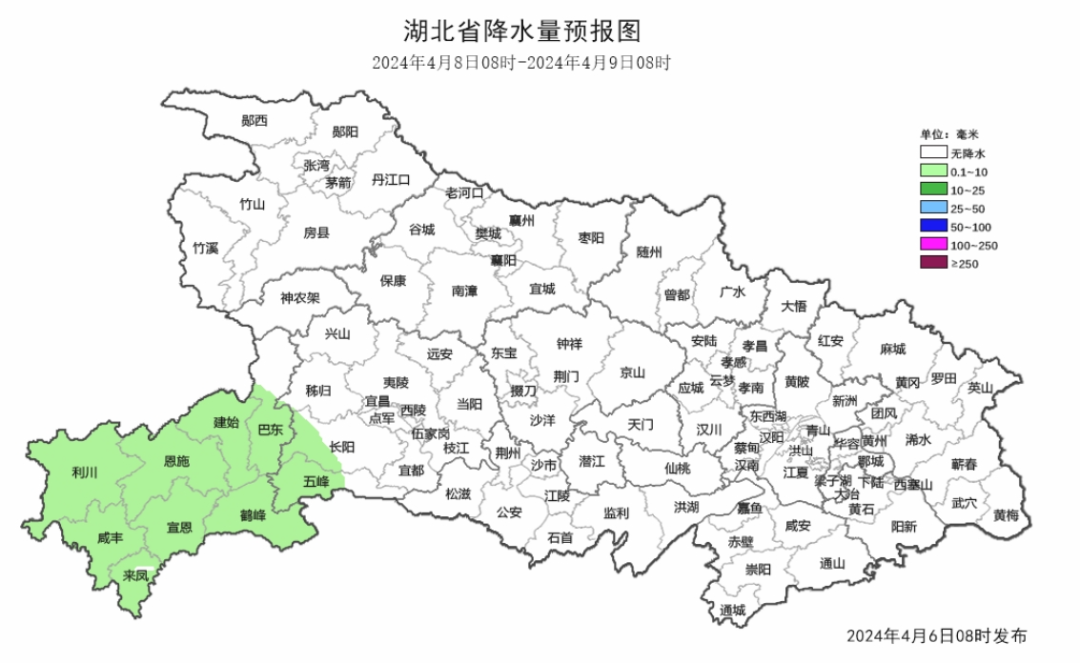 8日08时-9日08时,全省多云,其中鄂西南有短时小雨。最高气温21~25℃,最低气温12~15℃,偏北风2到4级。
