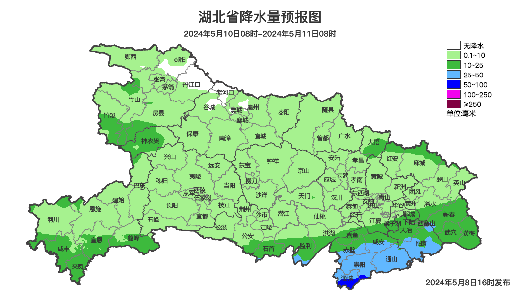 10日08时-11日08时,江汉平原南部、鄂东南阵雨转中到大雨,局地暴雨,伴有雷电;其他地区多云有阵雨或雷阵雨,局地中雨。最高气温鄂西北28~32℃、其他地区24~28℃,最低气温18~21℃,偏南风3到4级、阵风5到7级。