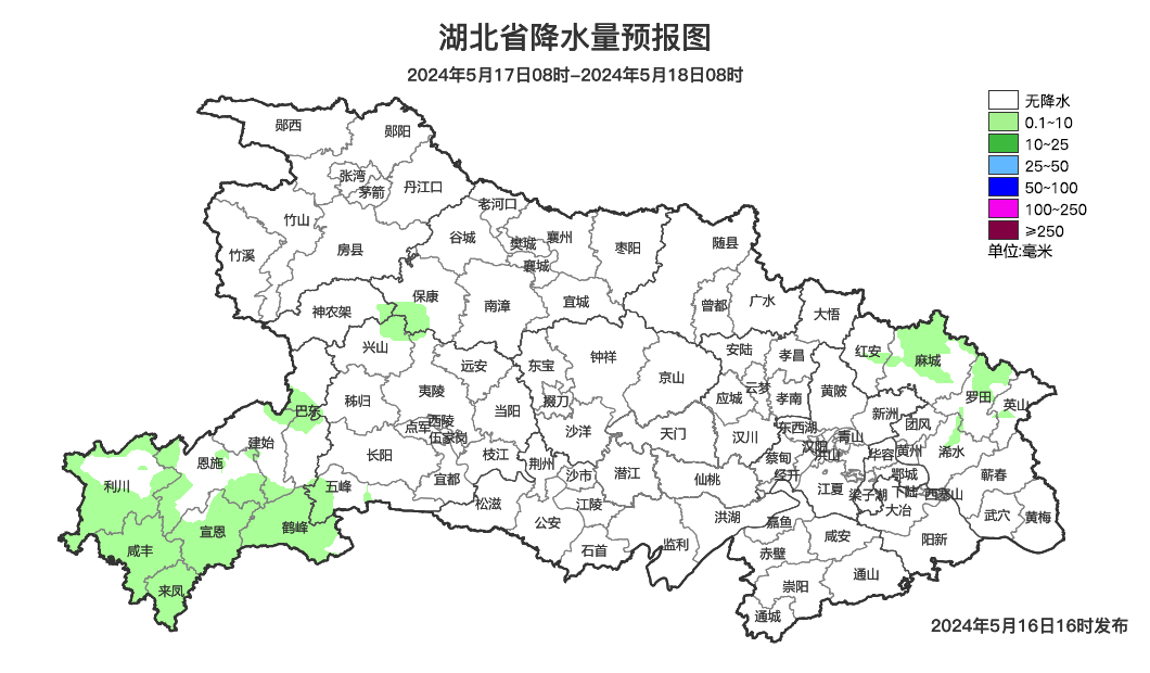 5月17日08时-18日08时,全省晴天到多云,其中鄂西南、鄂东北局地有阵雨或雷阵雨。最高气温鄂西北33~36℃,其他地区29~33℃,最低气温19~23℃,偏南风3到4级。