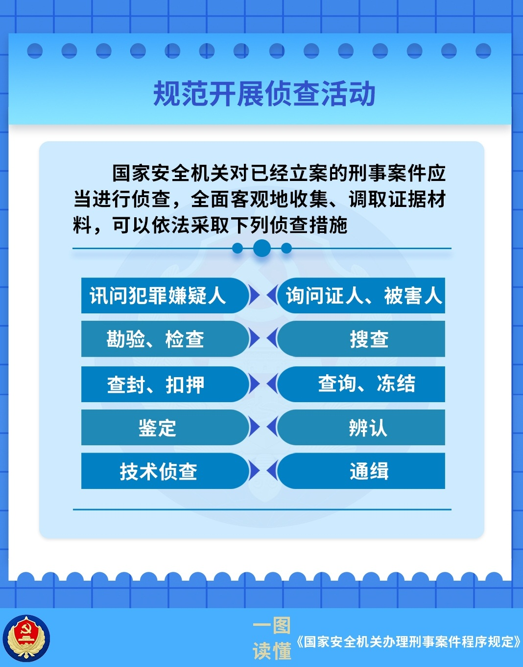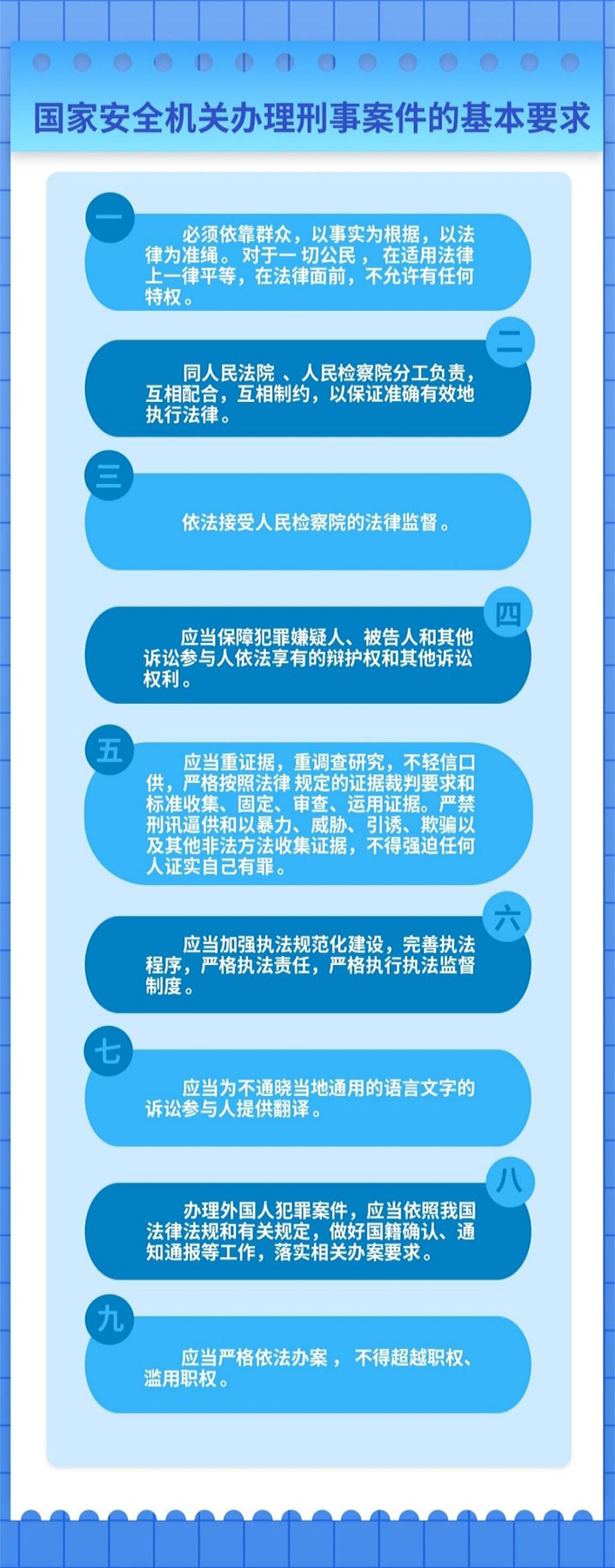 一图读懂丨《国家安全机关办理刑事案件程序规定》 2024-06-28 08:54 0 《国家安全机关办理刑事案件程序规定》将于2024年7月1日起正式施行。为便于公众理解国家安全机关办理刑事案件程序,掌握国家安全机关依法保障个人和组织合法权益的各项措施,国家安全部推出“一图读懂《国家安全机关办理刑事案件程序规定》”。 来源:国家安全部 一审:余梦婷 二审:陈玲 终审:汪洋