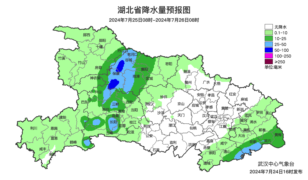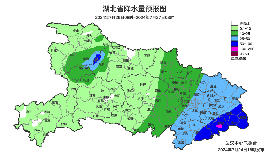 25日08时-26日08时,鄂西北多云转中到大雨、局地暴雨;鄂东南多云转小到中雨,局地大雨;其他地区多云有分散性阵雨或雷阵雨。西部局地伴有短时强降水、雷暴大风等强对流天气。最高气温35~38℃,最低气温25~30℃,偏北风2到3级转3到4级、阵风5到6级。