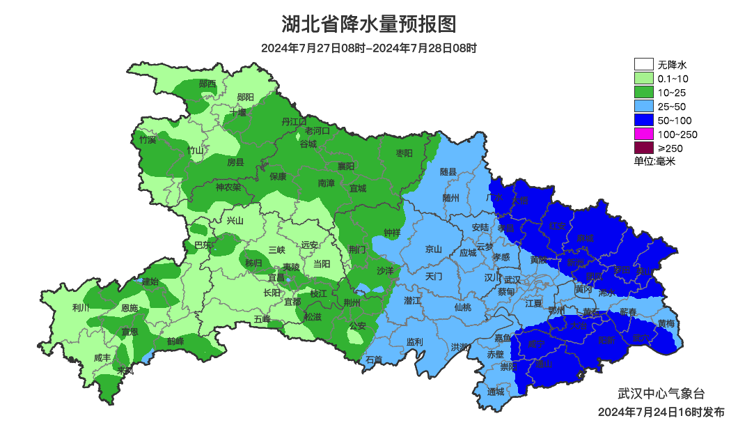 受其影响,预计25日夜间至28日,湖北东部和北部有大雨,咸宁、黄石、黄冈、鄂州、武汉、襄阳、十堰等地部分地区暴雨,单点大暴雨。高温天气将有所缓和,大部分地区最高气温降至30~34℃。此外,26日至27日中东部风力增大,阵风可达7到9级。