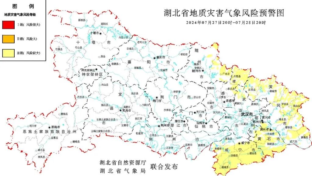 湖北省自然资源厅、湖北省气象局联合发布预警,2024年7月27日20时—7月28日20时,预计咸宁地区、黄石地区,随州(随县东北部、广水)、孝感(孝昌、大悟)、武汉(黄陂北部)、鄂州(鄂城区、梁子湖区)、黄冈(红安、麻城、罗田、英山、浠水、蕲春、武穴、黄梅)以及其他强降水区域发生崩塌、滑坡、泥石流的风险较大。