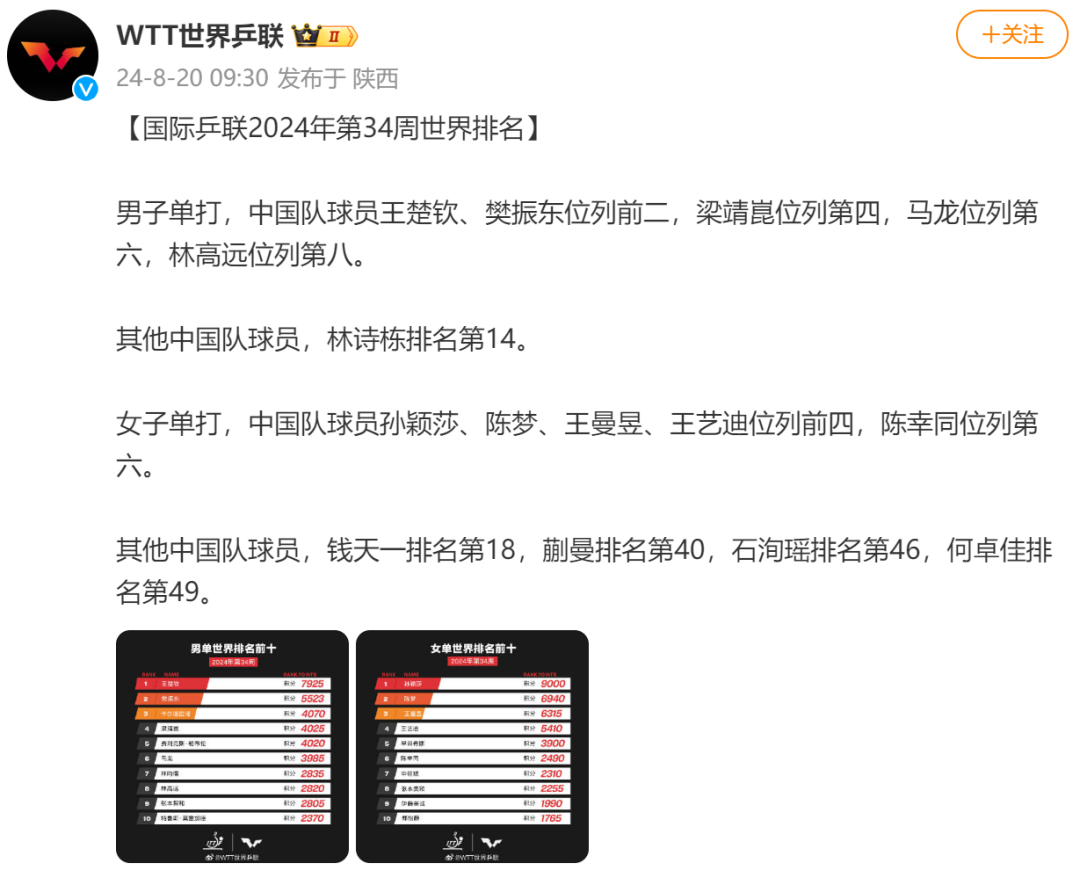 其他中国队球员,钱天一排名第18,蒯曼排名第40,石洵瑶排名第46,何卓佳排名第49。