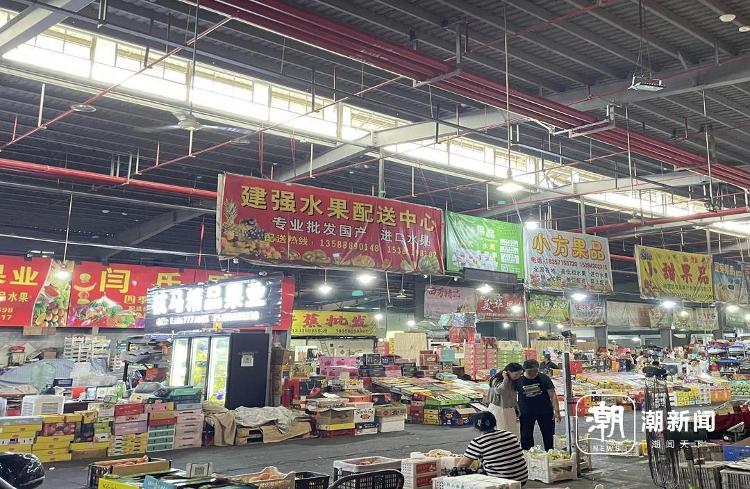 在文晖果品公司,各种水果摊位一个挨着一个,散客和批发商们穿梭其间,摊主们在各自的摊位前忙碌,推车和电瓶车载着水果进进出出,喧闹一片。
