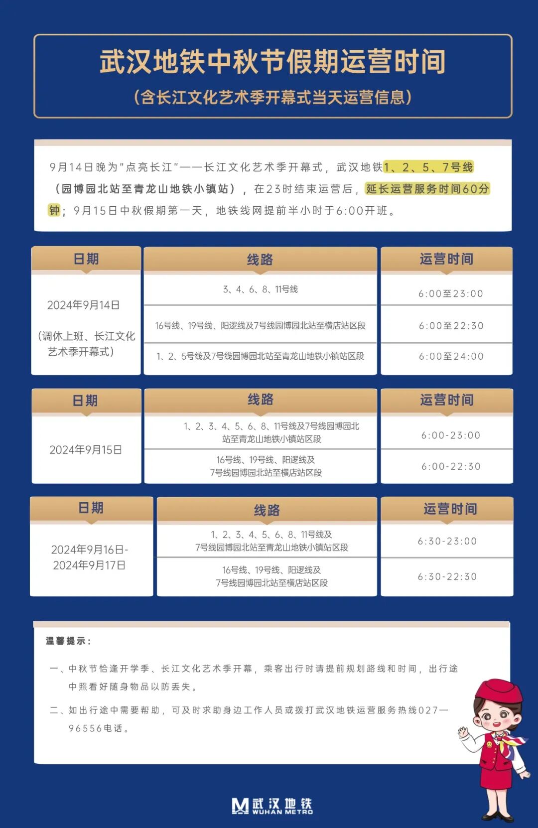9月14日晚为“点亮长江”——长江文化艺术季开幕式,武汉地铁1、2、5、7号线在23时结束运营后,1号线汉口北站至径河站、2号线天河机场站至佛祖岭站、5号线武汉站东广场站至红霞站、7号线园博园北站至青龙山地铁小镇站,延长运营服务时间60分钟。