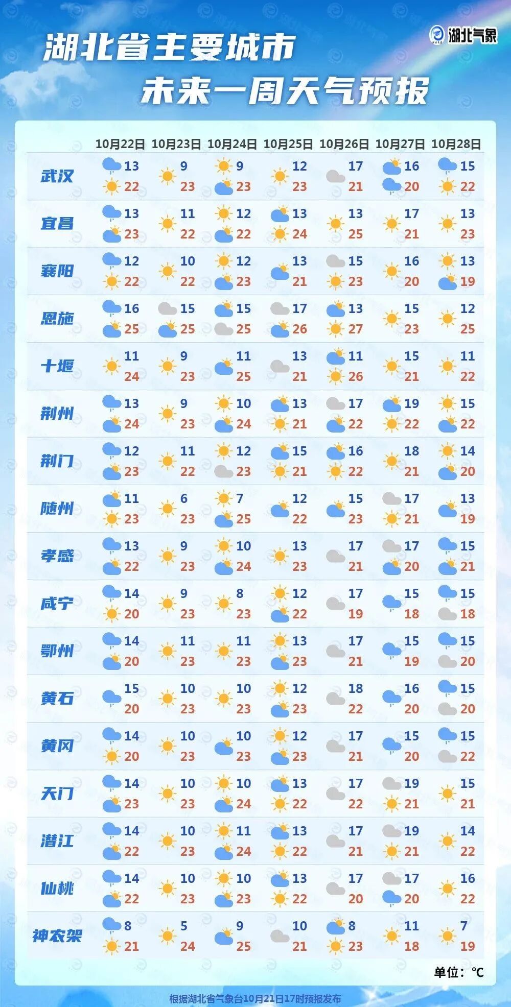 10月22日08时——10月23日08时,鄂东南、江汉平原东部小雨转多云;其他地区多云到晴天。最高气温中西部21℃~25℃、东部18℃~22℃,最低气温7℃~11℃,偏北风3到4级、阵风5到7级,夜间转2到3级。
