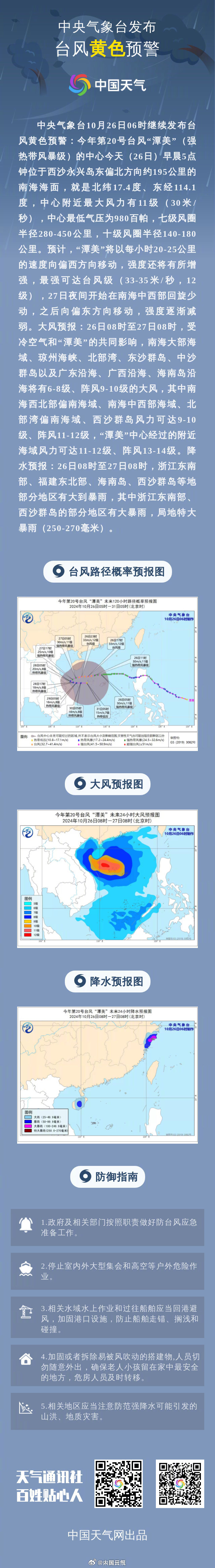 ①台风黄色预警:今年第20号台风“潭美”的中心今天(26日)早晨5点钟位于西沙永兴岛东偏北方向约195公里的南海海面。预计,“潭美”将以每小时20-25公里的速度向偏西方向移动,强度还将有所增强,最强可达台风级。