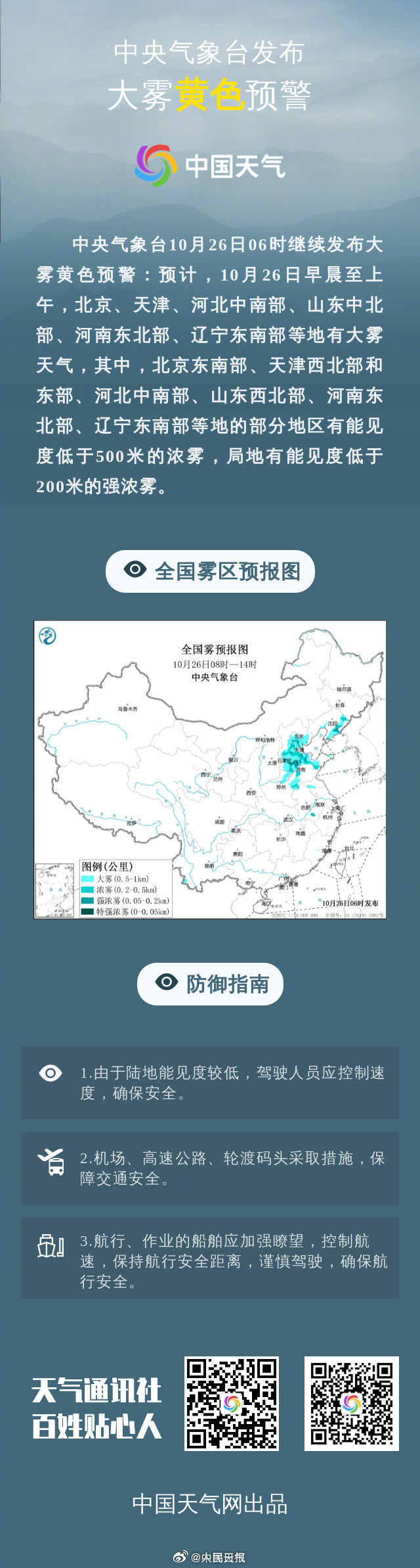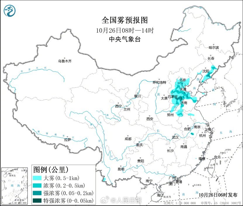 ②大雾黄色预警:预计,10月26日早晨至上午,北京、天津、河北、山东、河南、辽宁等地有大雾天气。其中,部分地区有能见度低于500米的浓雾,局地有能见度低于200米的强浓雾。