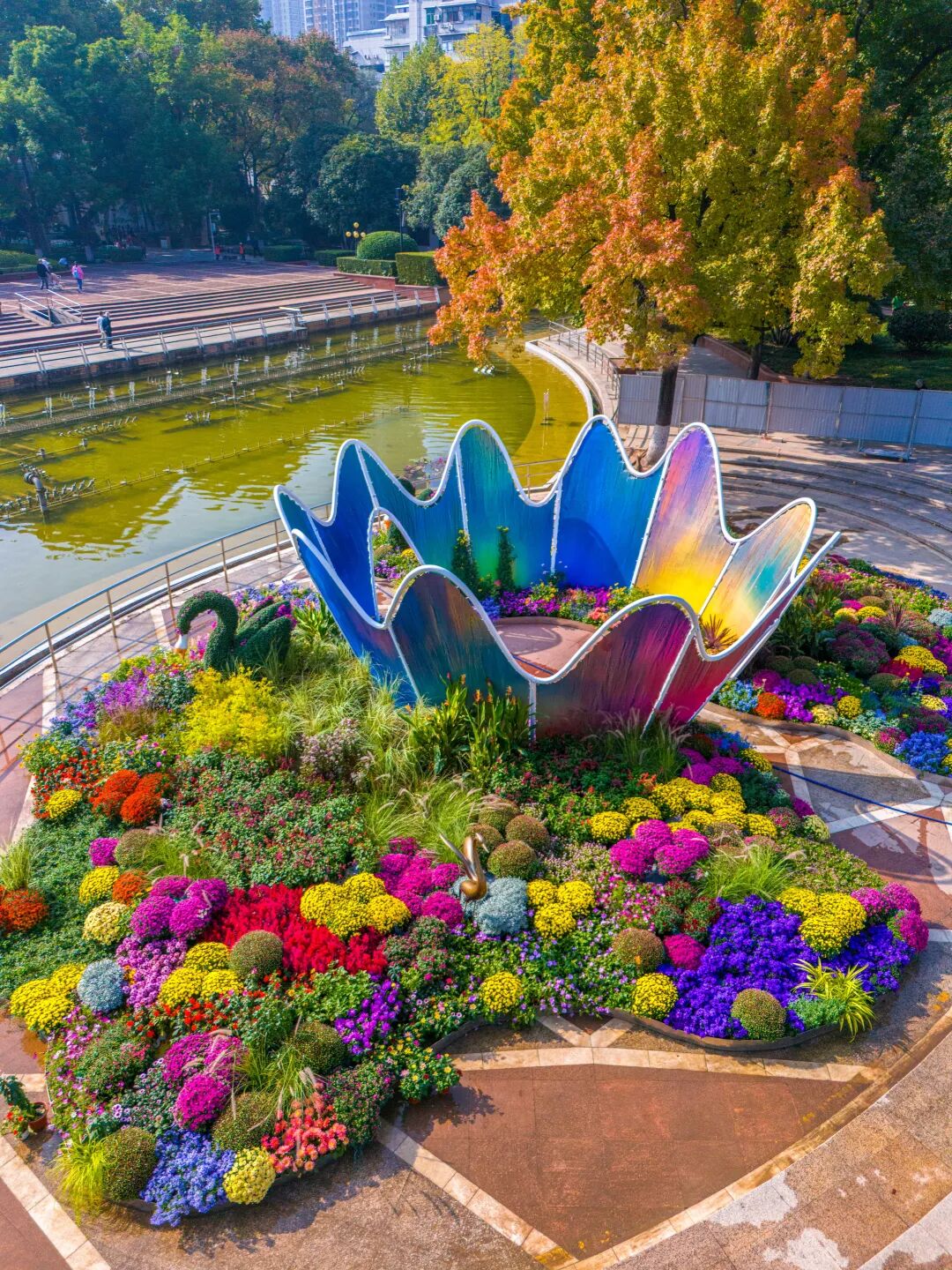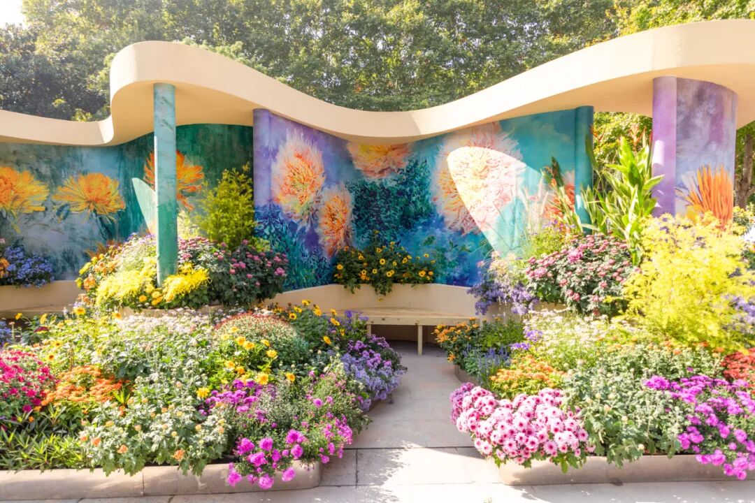公园主轴线中段设置有卷轴造型,油画风格的菊花绘画色彩绚烂。