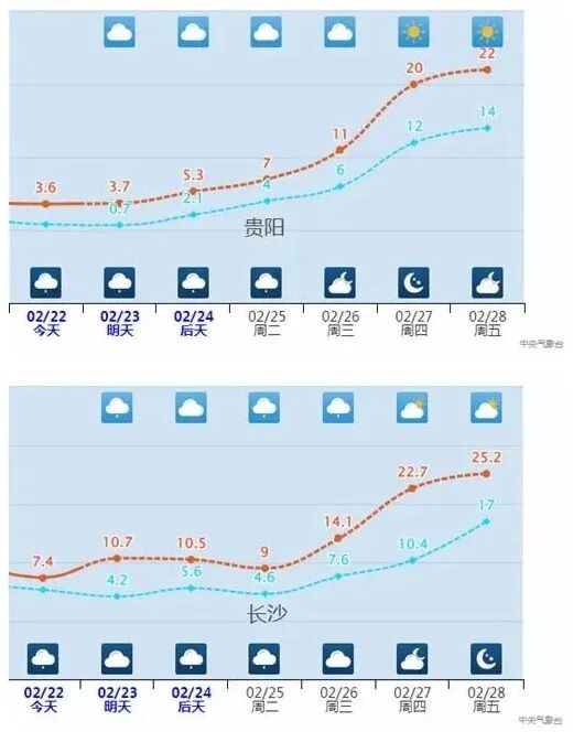 其中,一些城市的升温是“旱地拔葱”式的。像长沙25日至27日最高气温分别为9℃→14℃→23℃,直接一键切换到春天模式。贵阳26日最高气温11℃,27日就升至20℃,一天升幅达9℃。