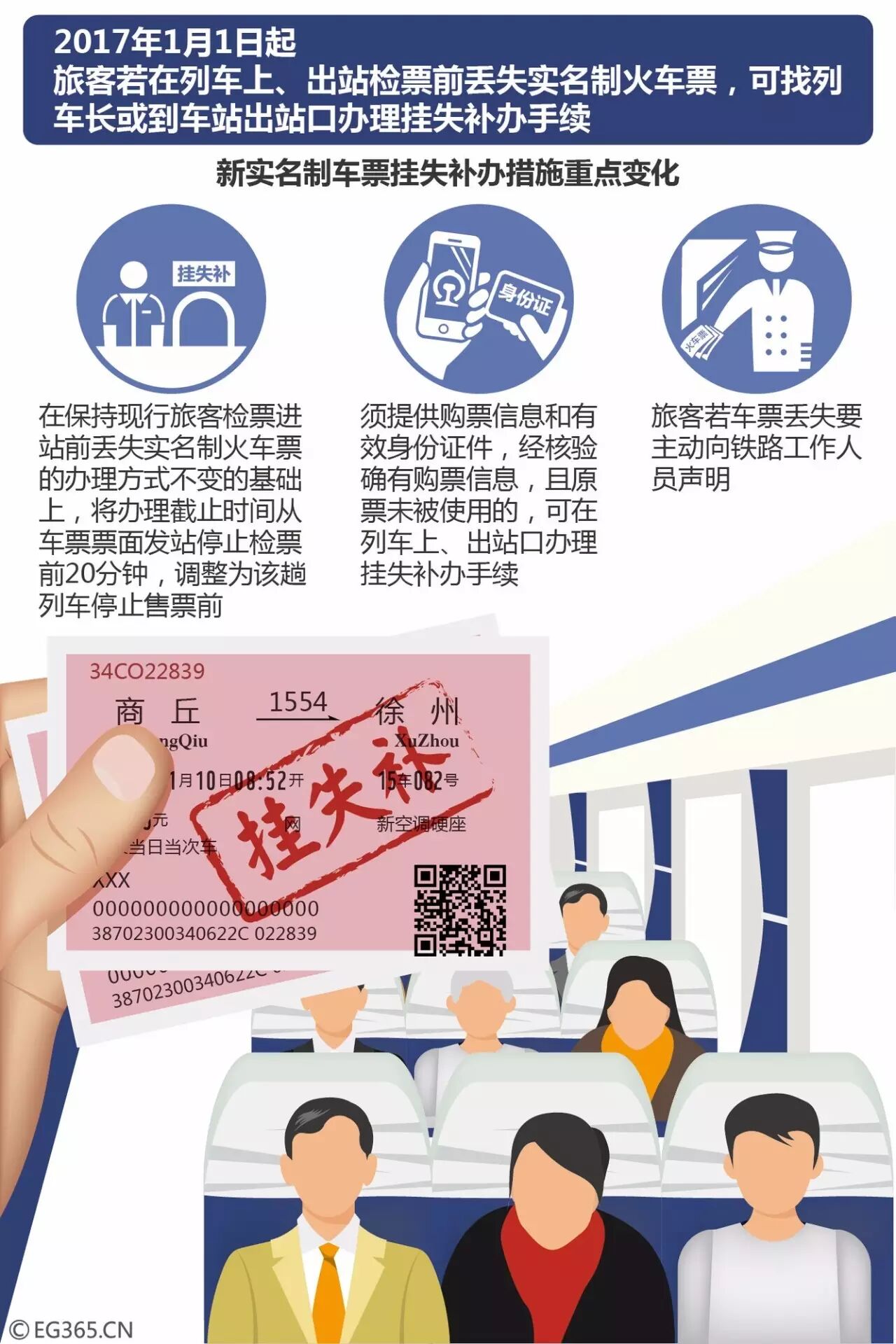 此前,乘客上车后票丢了,需要重新掏钱补票。2017年1月1日起,铁路新规规定,旅客若在列车上、出站检票前丢失实名制火车票,提供相关购票信息和有效身份证件,可在列车上、出站口办理挂失补办手续,且只收2元手续费。