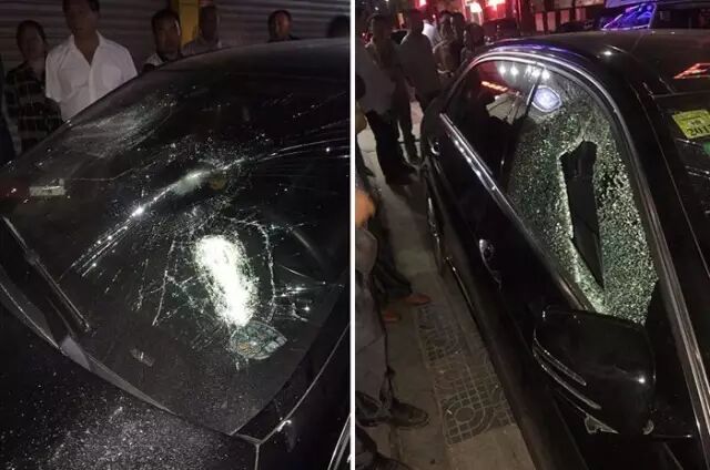 2个多小时后,黄某停放在路边的大奔突然遭到2名年轻男子用铁棍猛砸。奔驰车当即被砸得遍体鳞伤,惨不忍睹!前挡风玻璃、后视镜、门玻璃、门框等被砸得一塌糊涂。嫌疑人作案后迅速逃离了现场。