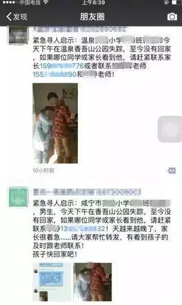 陈琛告诉记者:18日晚8:30,她看到微信朋友圈里很多好友的都在转发一条消息:我市某小学六年级学生韩某某于1月18日下午在温泉香吾山公园附近失踪,请大家帮忙转发寻找。作为一名母亲,陈琛感到很揪心:孩子这么小,家里人一定担心极了。于是,她不停地在网上转发失踪信息,希望孩子赶紧被找到。
